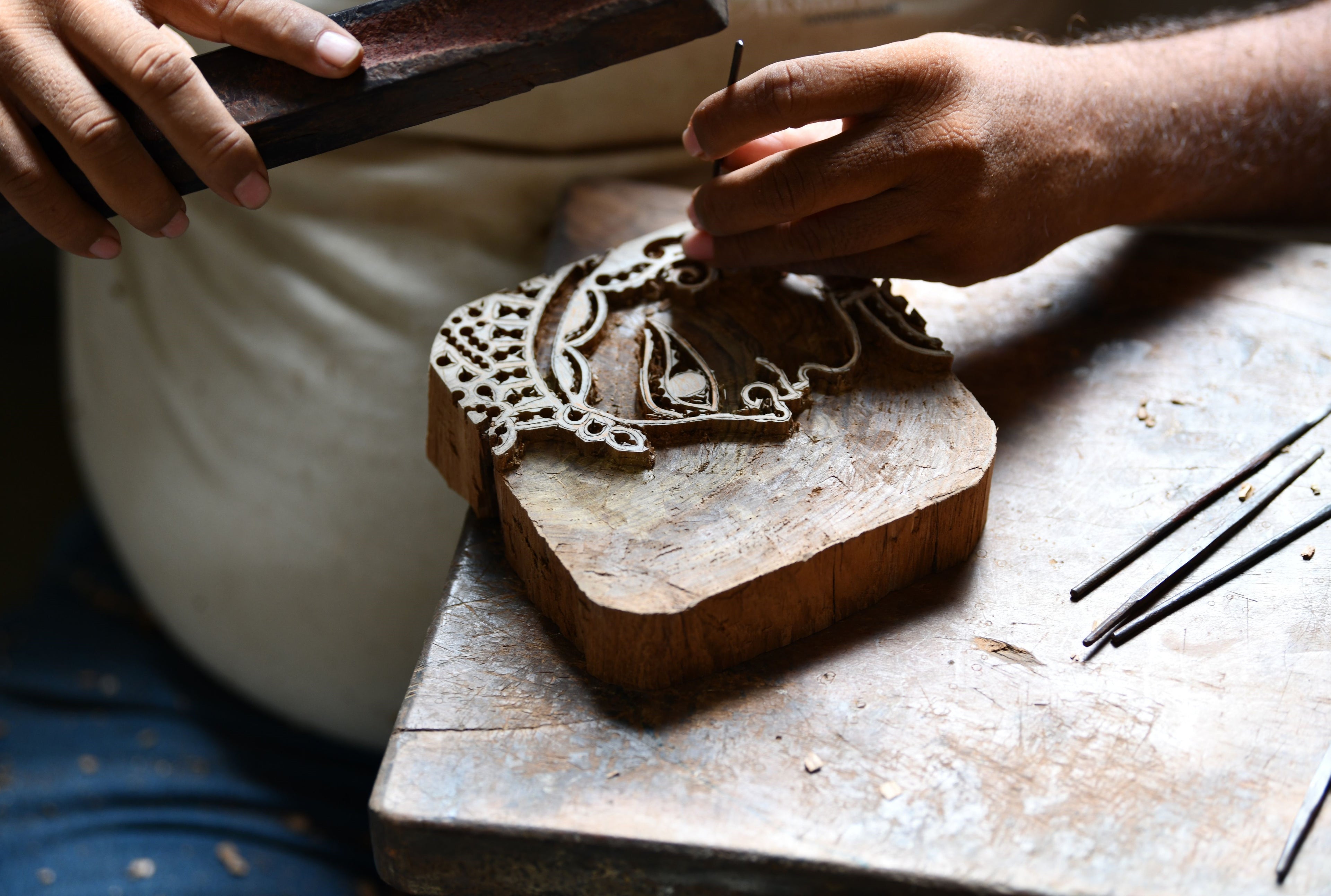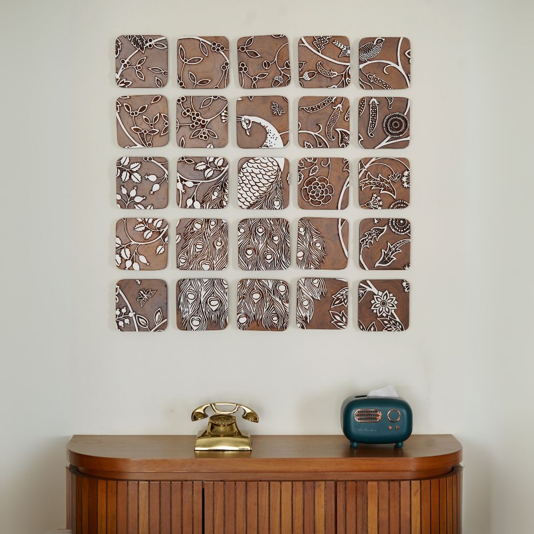 The peacock's majestic design features with intricate patterns and eyespots that shimmer in the light. Its stunning plumage, adorned with delicate feathers carefully handcrafted by block makers in teakwood is a true marvel of design.