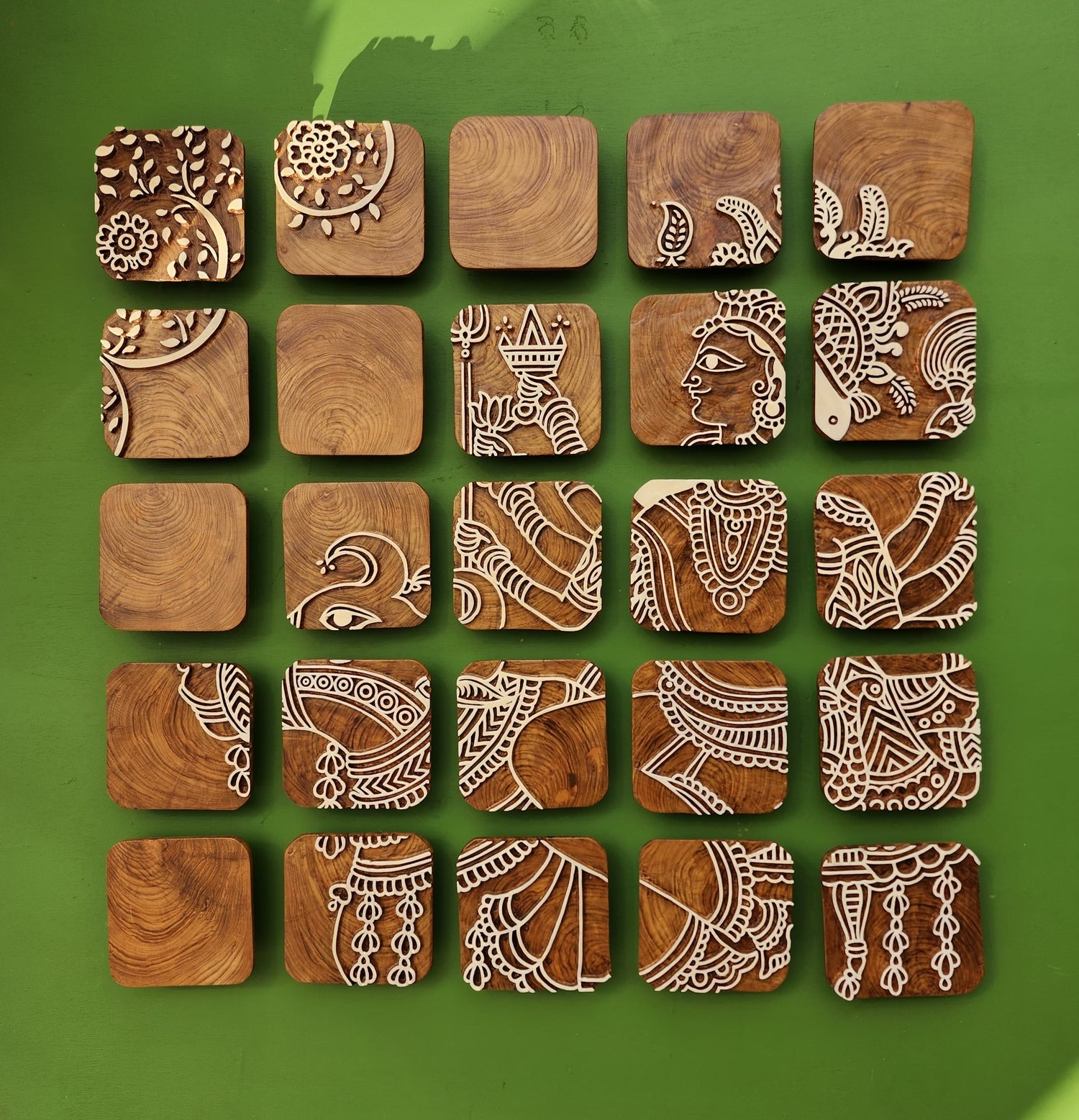 The 25 piece Teakwood set is an artwork created with the traditional block making process . The 6" blocks created like a jigsaw puzzle comes together to portray the goddess Devi Mata ji.